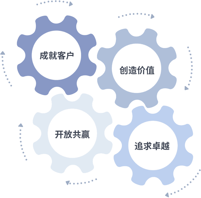 成就客户是一切决策的出发点,,,,创造价值是衡量所有工作的标准,,,追求卓越是我们做事做人的态度,,开放共赢是我们的格局也是最终的结果。。价值观的齿轮环环相扣,,推动着组织里的每个人不断向前。。。